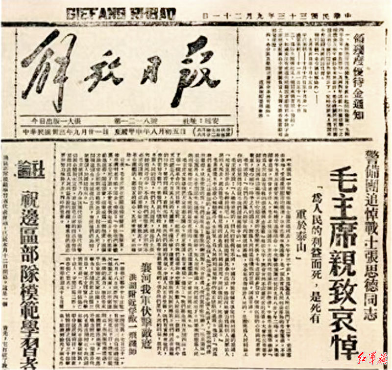 1944年9月21日,经毛泽东删节压缩定稿的《为人民服务》,以新闻稿的形式在延安《解放日报》第一版上发表。在延安,无论做地方工作的同志还是军队的同志看了这篇文章,无不深受教育。《解放日报》传到我党领导的各根据地、各单位,那里的同志们看了,也深受教育。许多同志把刊登这篇文章的报纸收藏起来,一有时间就拿出来反复阅读。延安之外的一些根据地报纸还转载了这篇文章。从此,为人民服务的思想深入人心,教育了一代延安时期的干部,形成了延安时期党政干部、人民军队全体指战员的精神财富,化成延安精神的重要组成部分。由此,本来作为毛泽东讲话文稿标题的“为人民服务”这五个大字,也便成了中国共产党人和人民军队的一面旗帜。
